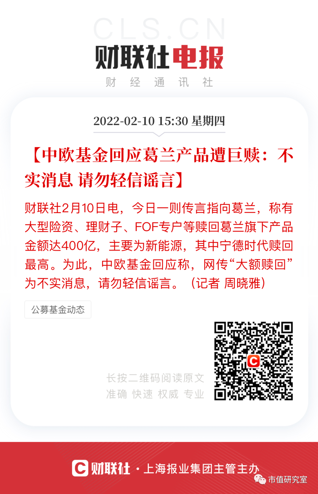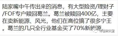 此外,今日社交媒体有传闻称,大型险资、理财子、FOF专户等大机构赎回中欧明星基金经理葛兰管理的基金份额,赎回了400亿。葛兰的几只全行业基金买了70%的新能源,宁德时代持有最高。