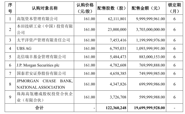 在这个成绩公布之前,宁德时代于2020年7月成功完成了一笔再融资,以每股161元增发1.22亿股,向9家认购对象配售增发的新股,募得资金共197亿元,明细如下: