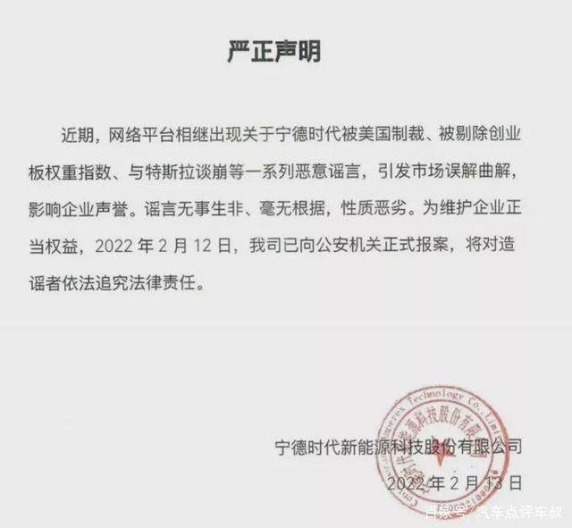 2月13日宁德时代发表声明,对此前出现的负面消息进行了统一回应。在这份声明中,宁德时代表示近期关于宁德时代被制裁、被剔除创业板权重指数、与特斯拉谈崩等消息均属恶意谣言,引发了市场误解曲解,影响了宁德时代企业声誉。同时,宁德时代也已向公安机关正式报案,将对造谣者依法追究法律责任。