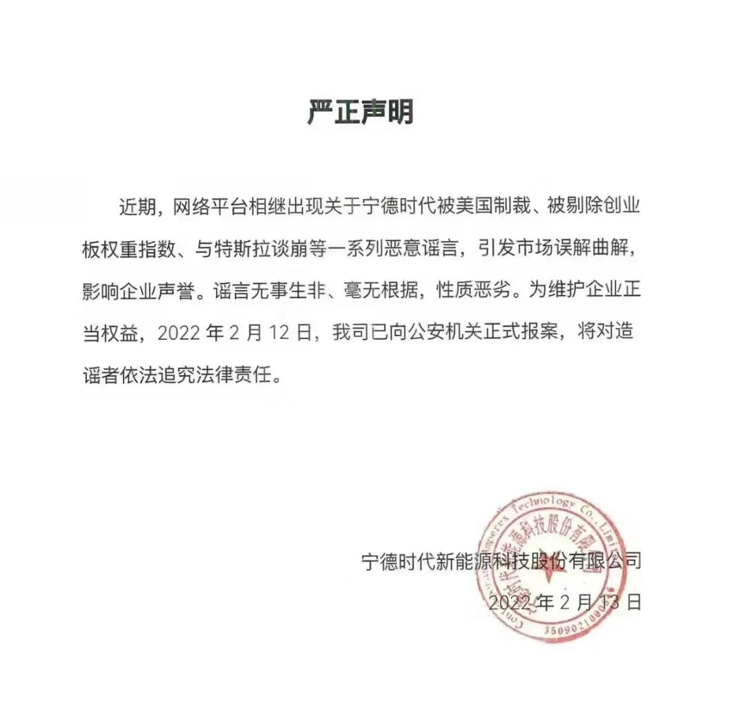 “近期,网络平台相继出现宁德时代被美国制裁、被剔除创业板权重指数、与特斯拉谈崩等一系列恶意谣言,引发市场误解曲解,影响企业声誉,谣言无事生非,毫无根据,性质恶劣,宁德时代2月12日已向公安机关报案,将对造谣者依法追究法律责任。”