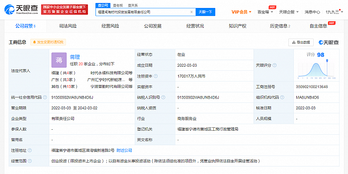 App显示,3月3日,福建闽海时代投资发展有限责任公司成立,注册资本约17亿人民币,法定代表人为蒋理,经营范围包括创业投资;以自有资金从事投资活动。股东信息显示,该公司由宁德时代新能源科技股份有限公司、宜春锂都时代投资发展(有限合伙)共同持股。