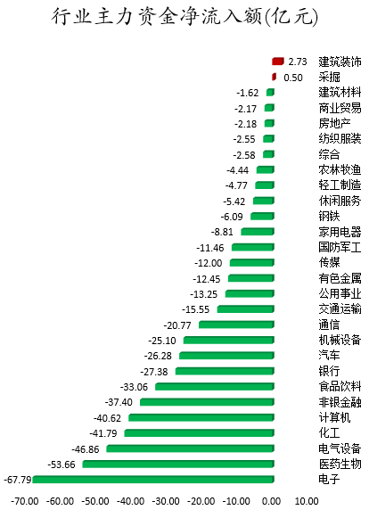 从行业板块来看,申万所属的28个一级行业,今日仅有建筑装饰、采掘2个行业板块主力资金呈现净流入,净流入金额分别为2.73亿元、0.5亿元。26个行业板块主力资金呈现净流出,其中,电子行业板块主力资金净流出最多,净流出金额为67.79亿元;行业板块主力资金净流出靠前的还有医药生物、电气设备、化工、计算机、非银金融、食品饮料,净流出金额分别为53.66亿元、46.86亿元、41.79亿元、40.62亿元、37.4亿元、33.06亿元。