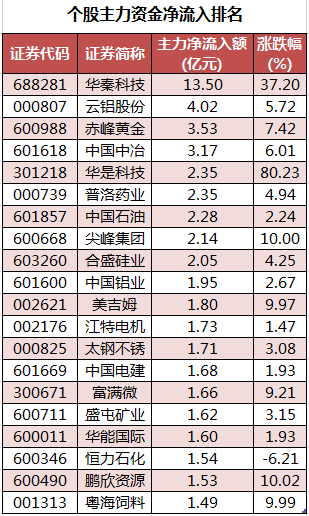 个股来看,今日有1307只个股获主力资金净流入,其中,36股获主力资金净流入超1亿元。华秦科技获主力资金净流入最多,净流入金额为13.5亿元;主力资金净流入居前的个股还有云铝股份、赤峰黄金、中国中冶、华是科技、普洛药业,净流入金额分别为4.02亿元、3.53亿元、3.17亿元、2.35亿元、2.35亿元。