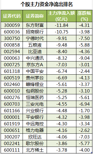 此外,3330只个股被主力资金净卖出,其中,116股被主力资金净卖出超1亿元。主力资金净流出最多的个股是东方财富,净流出金额为11.84亿元;主力资金净流出居前的个股还有招商银行、宁德时代、五粮液、比亚迪、中兴通讯,净流出金额分别为10.75亿元、9.91亿元、9.48亿元、8.4亿元、8.32亿元。