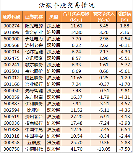 活跃个股方面,北向资金净买入较多的有阳光电源、紫金矿业、长江电力、泸州老窖、亿纬锂能,净买入金额分别为5.45亿元、3.26亿元、2.96亿元、2.62亿元、2.17亿元。北向资金净卖出较多的有宁德时代、五粮液、中国平安、中国中免、招商银行,净卖出金额分别为13.05亿元、9.36亿元、8.34亿元、7.45亿元、7.24亿元。