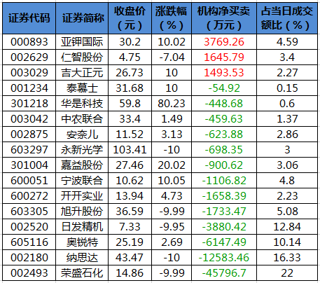 盘后龙虎榜数据显示,今日机构席位资金合计净卖出约6.92亿元。其中,净买入的个股3只,净卖出的个股13只。机构净买入最多的股票是亚钾国际,净买入金额约3769.26万元;机构净买入的还有仁智股份、吉大正元。机构净卖出最多的股票是荣盛石化,净卖出金额约4.58亿元。机构净卖出靠前的还有纳思达、奥锐特、日发精机等股。