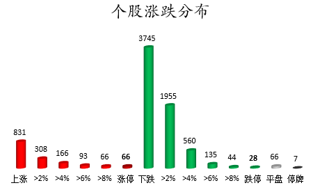 截至收盘,沪深两市合计831只个股上涨,3745只个股下跌,平盘个股66只,停牌的个股7只。不含当日上市新股,共有66只个股涨停,28只个股跌停。