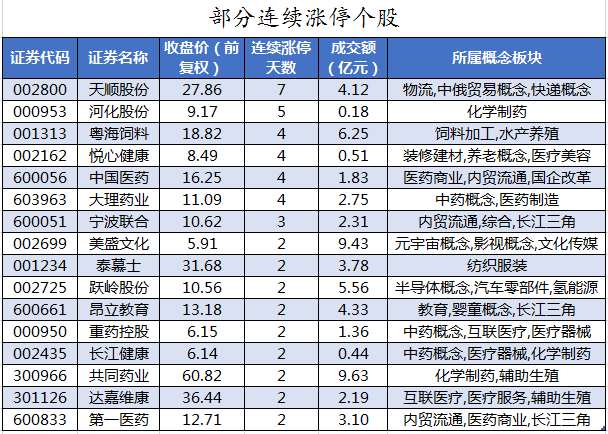 涨停股中,从收盘涨停板封单量来看,中国医药最受追捧,收盘涨停板封单有6192.76万股;其次是长江健康、悦心健康等,涨停板封单分别有3862.48万股、3595.3万股。以封单金额计算,中国医药、悦心健康、长江健康等涨停板封单资金较多,分别有10.06亿元、3.05亿元、2.37亿元。