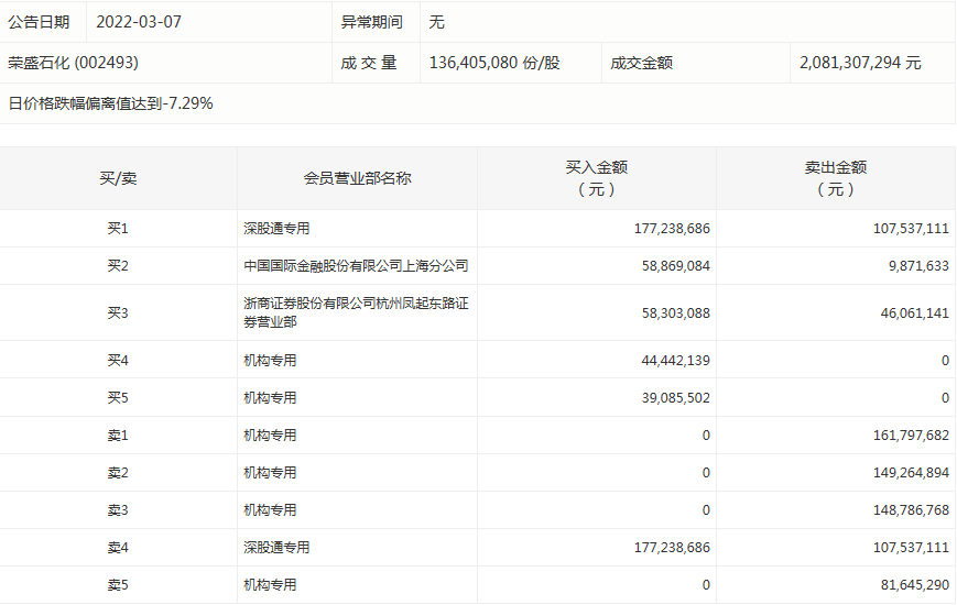 荣盛石化今天跌停。盘后数据显示,6个机构出现在龙虎榜单上,合计净卖出4.58亿元。中国国际金融股份有限公司上海分公司买入5886.91万元,同时卖出987.16万元;浙商证券股份有限公司杭州凤起东路证券营业部买入5830.31万元,同时卖出4606.11万元。