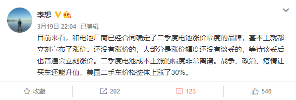 值得注意的是,对于近期新能源汽车的涨价潮,理想汽车CEO李想通过社交媒体表示,今年二季度电池成本上涨的幅度“非常离谱”。从目前来看,和电池厂商已经签订合同确定了二季度电池涨价幅度的品牌,基本上都立刻宣布了涨价。还没涨价的品牌,大部分是涨价幅度尚未谈妥,等谈妥后也普遍会立刻涨价。