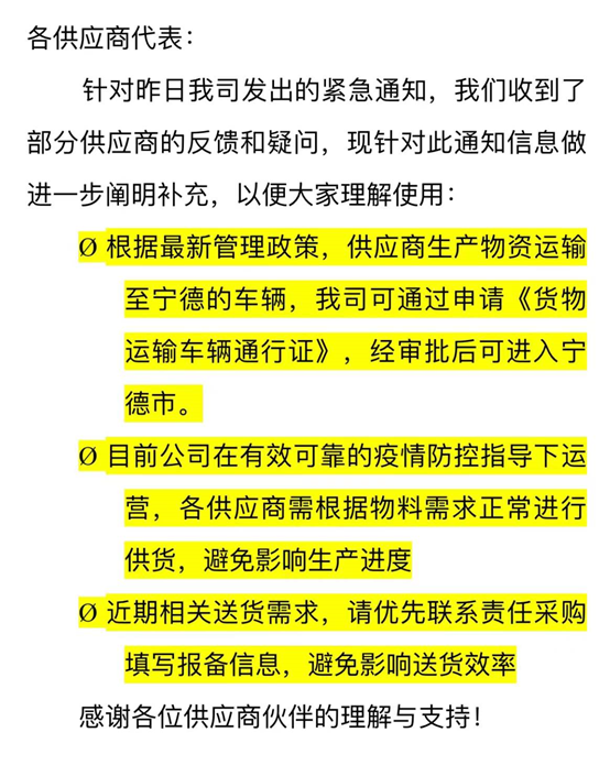 不过关于宁德封控方面似乎又有了新进展,网上有截图显示,某公司对供应商代表发布关于此前紧急通知的补充,其表示,根据最新管理政策,供应商生产物资运输至宁德的车辆,公司可以通过申请《货物运输车辆通行证》,经审批通过后可以进入宁德市;