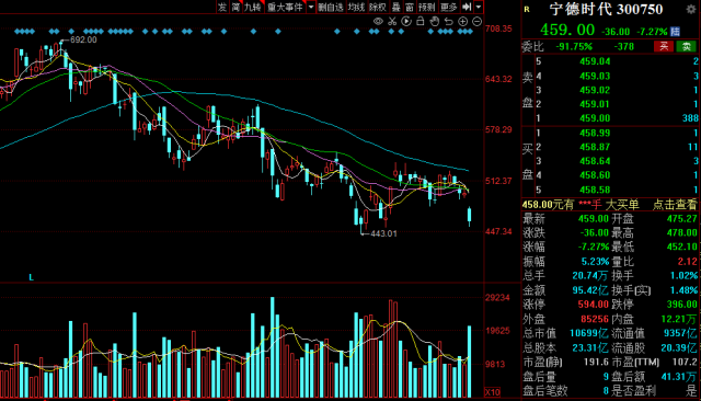 受此影响,4月11日,宁德时代股价低开低走,最大单日跌幅达到8.67%,最低报42.90元/股。至收盘,仍下跌36.00元/股或7.27%,其总市值从上周五的11538亿元回落至10669亿元,一日蒸发839亿元。