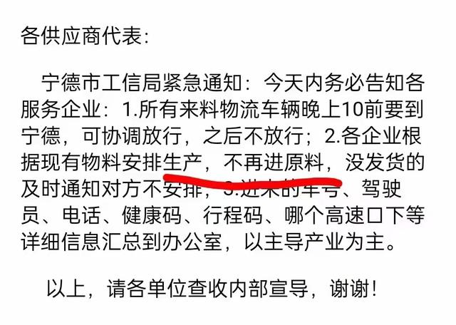 与此同时,一张有关宁德市工信局关于供应商物流车辆管控消息的截图也随后在网上流传。截图显示,所有来料物流车辆晚上10点前要到宁德,可协调放行,之后不放行;各企业根据现有物料安排生产,不再进原料,没发货的及时通知对方不安排等。