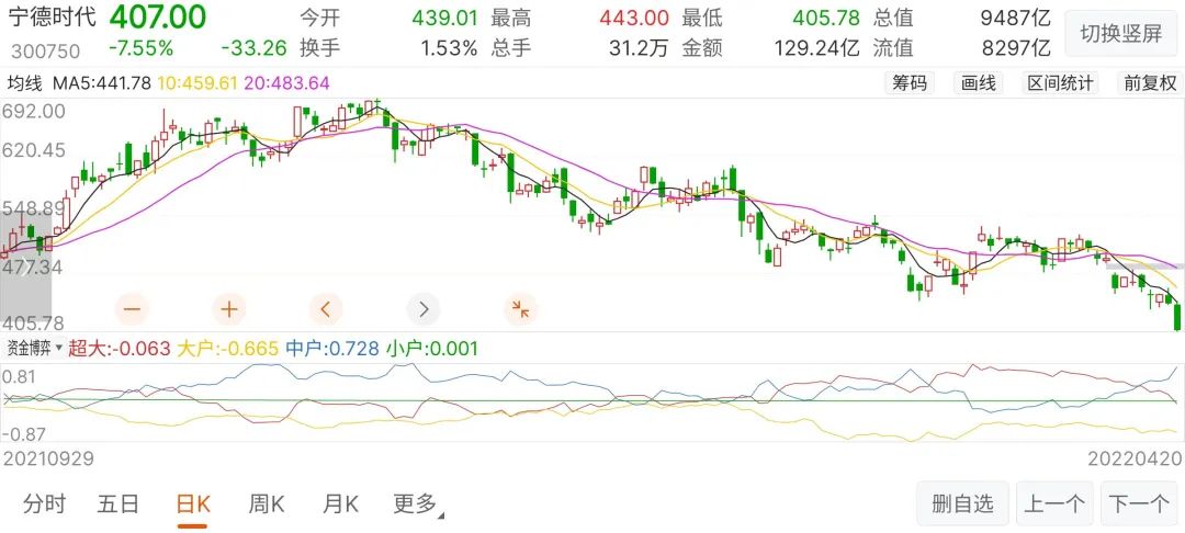 不管是今日带崩创业板的宁德时代和阳光电源,还是新能源个股赛道的股票,都在这个春天进入了至暗时刻。今日收盘,宁德时代跌7.55%,亿纬锂能跌4.71%,天齐锂业跌3.31%,隆基股份跌3.33%。