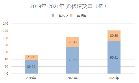 光伏逆变器是阳光电源的发家业务。于光伏市场景气度并不高的2019年,营收占比突破60%,接近80亿元,并拿下超2400MW的竞价和平价项目,规模位居民企之首。在2019年、2020年、2021年,逆变器产品分别达成主营收入39.42亿、75.15亿、90.51亿,逐年上涨;但是主营利润却上涨不大:13.30亿、26.33亿、30.59亿。
