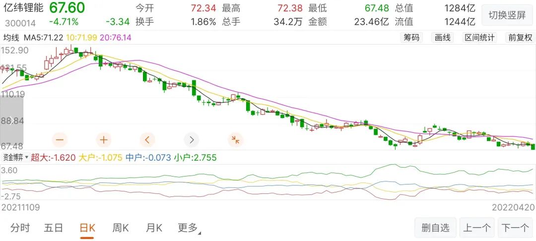 电池茅宁德时代股价下跌三分之一,截至收盘,宁德时代跌7.55%报407.00元,市值一日蒸发775.29亿元,总市值跌至1万亿元以下。光伏茅隆基股份同样下跌三分之一,从最高点100.20元下降了33.40元,截至收盘,隆基股份跌3.33%报66.80元。亿纬锂能股价腰斩至一半以下,距离五个月前的最高点148.75元有81.15元的差距,截至收盘,亿纬锂能跌4.71%报67.60元。