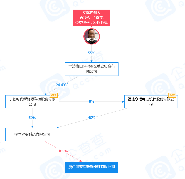 股权穿透图显示,同安润新由时代永福科技有限公司100%持股,而时代永福的大股东则是宁德时代(持股60%),二股东为永福股份(持股40%)。