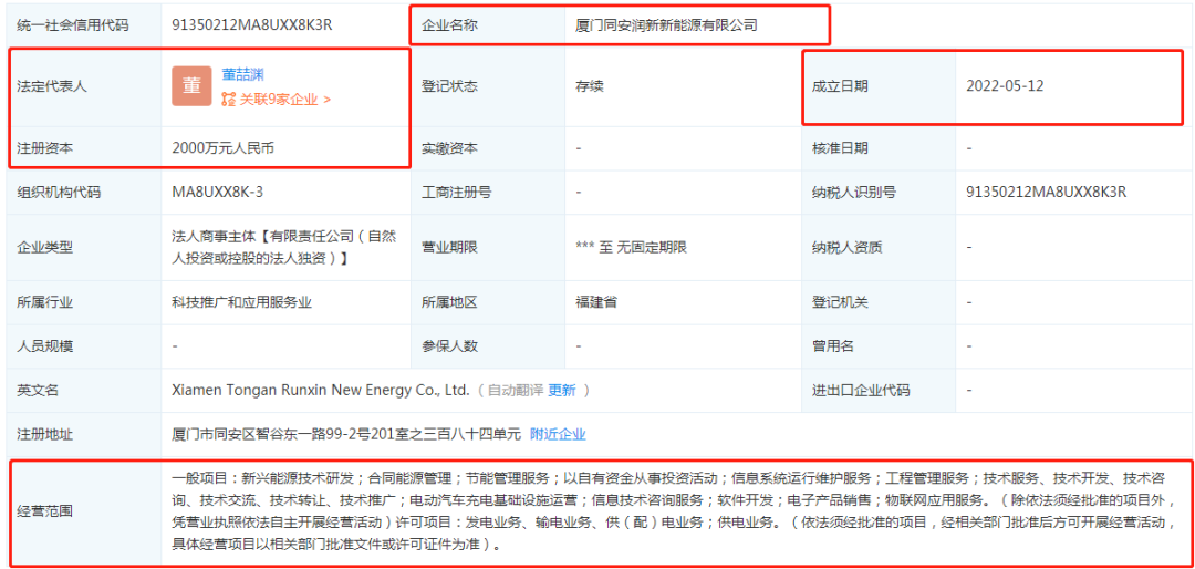 该公司法定代表人为董喆渊,注册资本2000万元人民币,经营范围包括新兴能源技术研发;节能管理服务;电动汽车充电基础设施运营等。