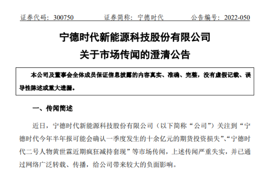 进入6月,负面消息反而越来越多,“宁德时代半年报可能会确认一季度发生的十余亿元的期货投资损失”、“宁德时代二号人物黄世霖近期疯狂减持套现”等传闻开始出现。