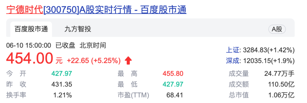 也是在今天,宁德时代在昨晚发布了紧急澄清公告后,股价也实现了大涨,收盘报454.00元,市值10582亿元。