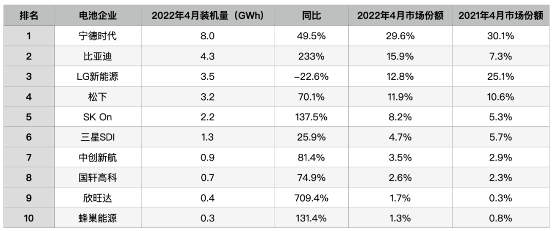 而比亚迪装机量环比上涨2.4%,首次超越LG新能源夺得亚军,市占率也从3月10.1%上升至15.9%。