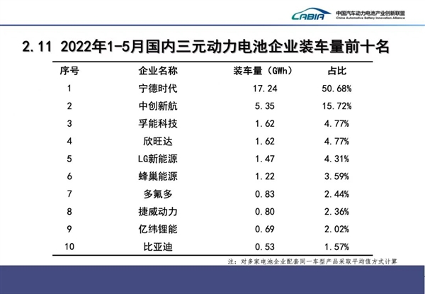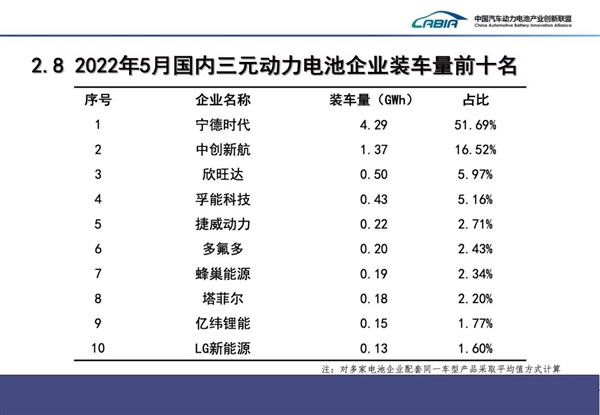 6月10日消息,中国汽车动力电池产业创新联盟在其官微,发布了2022年5月国内动力电池企业装车量前15名的榜单。