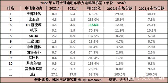 据韩国市场研究机构SNEResearch公布的数据显示,2022年4月,全球电动车电池装机量达27.1GWh,同比增长52.3%,连续22个月保持稳定增长。其中,宁德时代依旧在榜单中强势领跑,以8GWh的装机量遥遥领先,但同比增幅(49.5%)较前两月有所收窄,市场份额也从去年同期的30.1%降至29.6%。