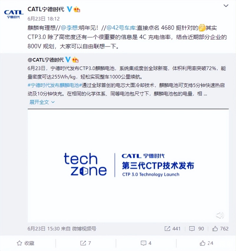 宁德时代发布麒麟电池后,理想汽车创始人李想转发了相关消息的微博,并称“明年见”,随后宁德时代则在微博互动称“麒麟有理想”。我们推测,理想汽车明年推出的纯电车型将搭载麒麟电池。