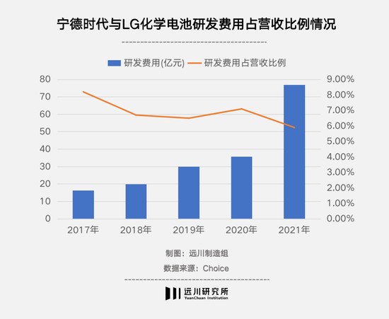 但看研发费用,宁德时代过去五年的投入也不算低,占营收比值始终维持在6-8%之间,直到2021年下游需求的爆发式增长,才使这一比例下降至5%。