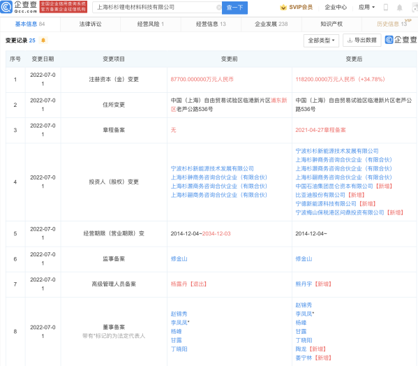 近日,智车派注意到,根据数据信息,上海杉杉锂电材料科技有限公司发生了工商变更。新增了中国石油集团昆仑资本有限公司、比亚迪股份有限公司、宁德时代科技有限公司、宁波梅山保税港区问鼎投资有限公司等新股东。同时,杨露丹退出了这家公司的高管行列,新增熊丹宇、陶龙、姜宁林等人为董事。