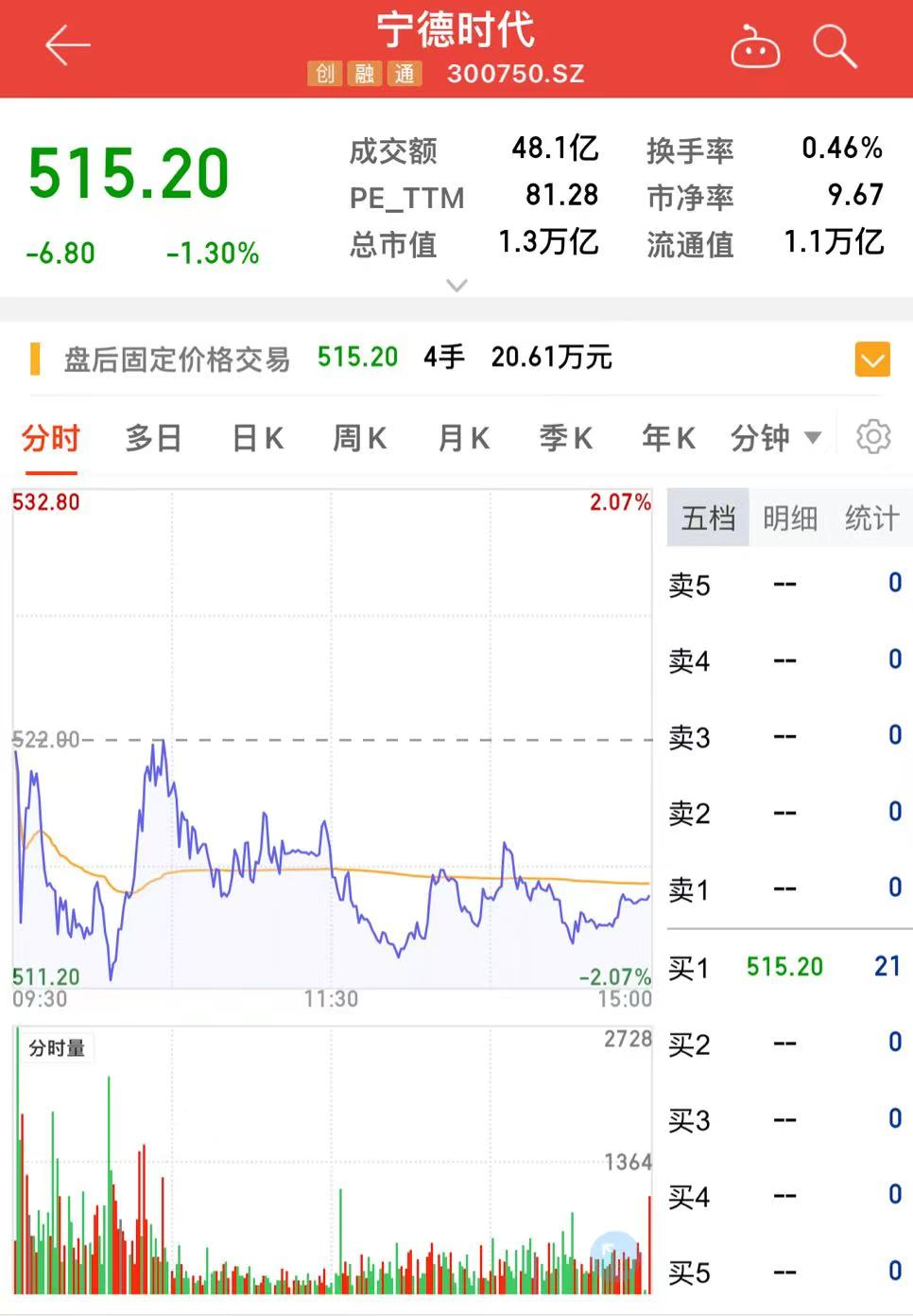 同花顺数据显示,截至7月27日收盘,宁德时代报515.2元/股,跌1.3%,总市值为1.3万亿元。