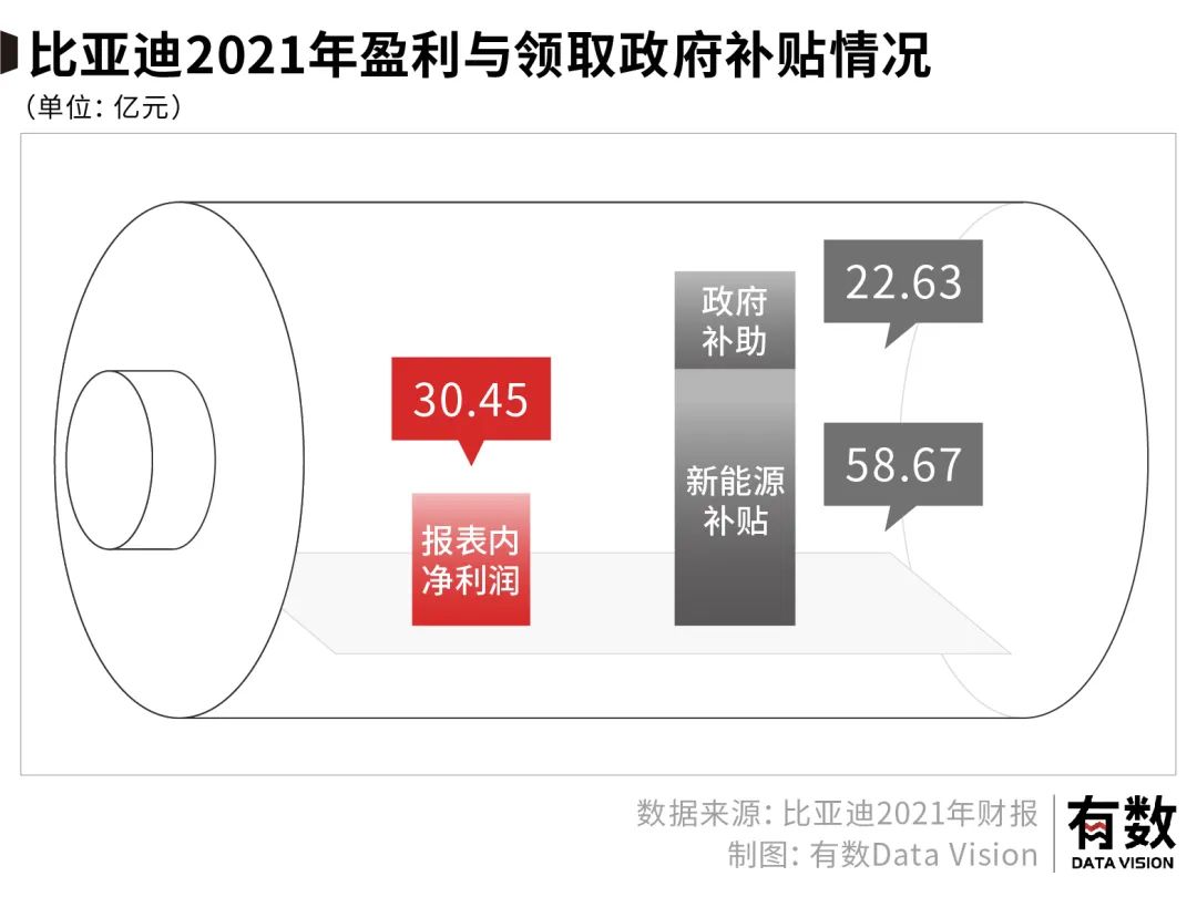 2021年,比亚迪汽车业务的毛利率达到17%,高于绝大多数国产汽车品牌。不过财报显示,比亚迪这一年收获的新能源补贴与政府补助高达80亿元,这笔额外收入中还没有计入新能源积分交易的收入,相比之下,比亚迪同期的归母净利润只有30亿元。