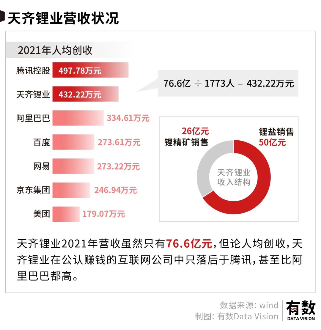 2021年,天齐锂业的锂盐产线(主要是碳酸锂)接近满产,营收达到50亿元,多开采的锂矿直接销售也带来了26亿元的收入。如果将这些收入平摊到天齐锂业1773个员工头上,人均创收甚至比阿里巴巴还高。
