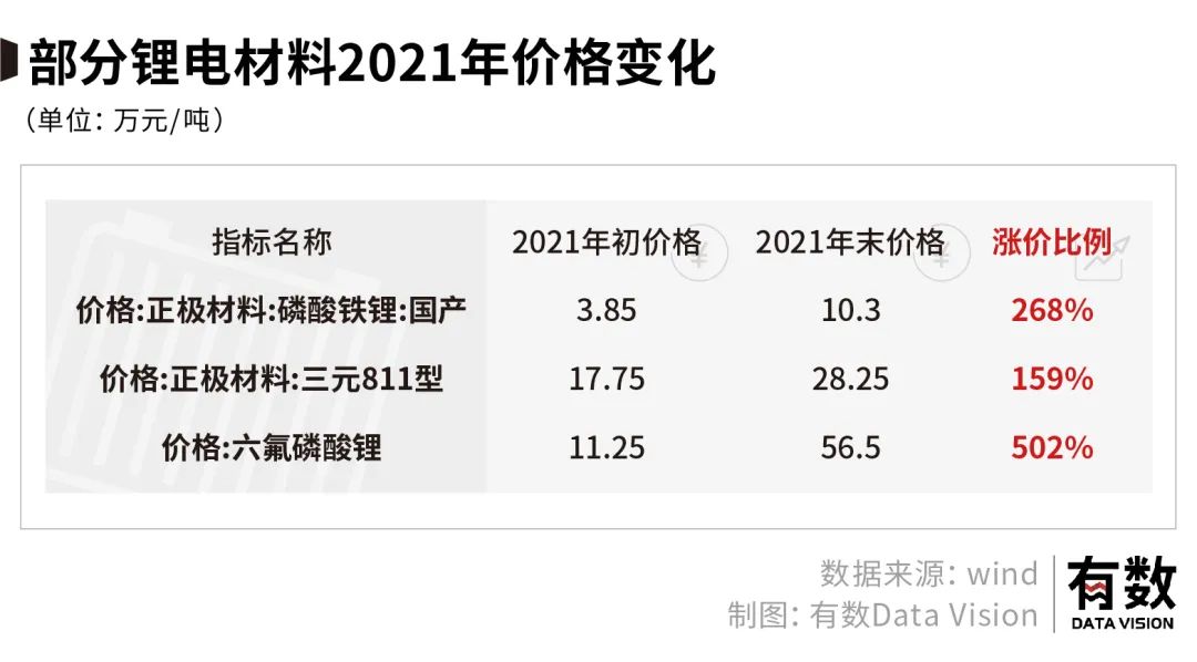 2021年之前,动力电池的材料成本结构大致是:正极30%、负极18%、电解液6%、隔膜6%。但在去年涨价之后,正极材料的成本占比已经接近50%。