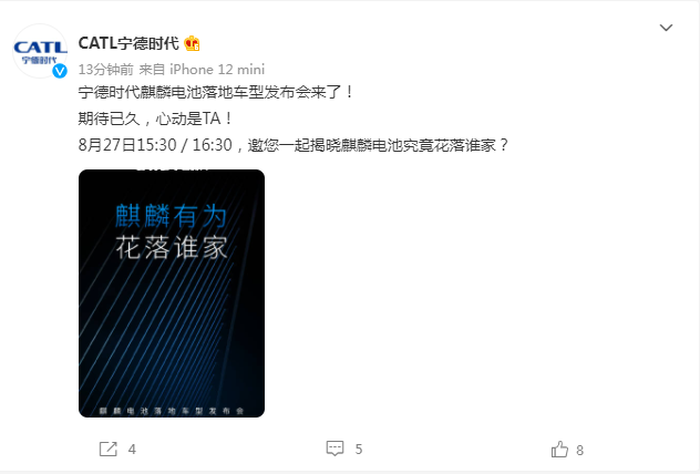 据宁德时代(SZ300750,股价511元,市值1.2万亿元)官方微博8月26日消息,宁德时代将于8月27日15:30-16:30举行麒麟电池落地车型发布会。
