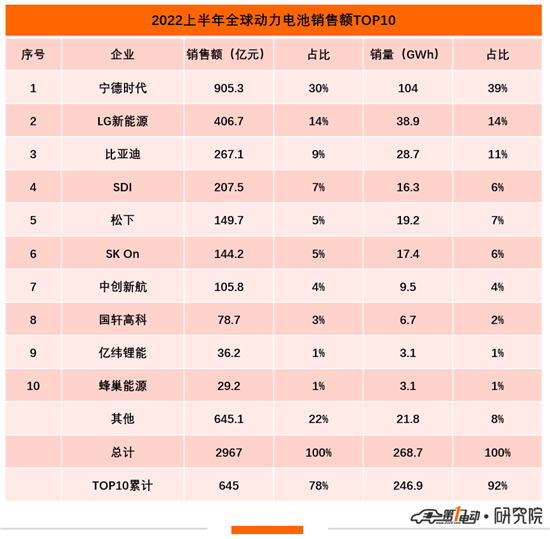 9月13日,SNE Research 发布了2022年上半年全球动力电池市场销售数据。上半年全球新能源汽车销量为435万辆,同比增长65%。上半年,全球动力电池市场规模达427.3亿美元(约合人民币2967亿元),其中前十名动力电池企业的销售额达334.66亿美元(约合人民币645亿元),市占率为78%。
