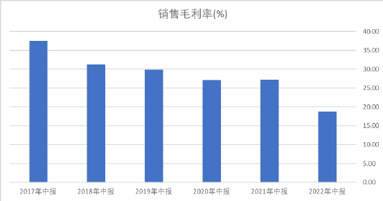 和2017年半年报相比,公司2022年半年报中,毛利率差不多腰斩。