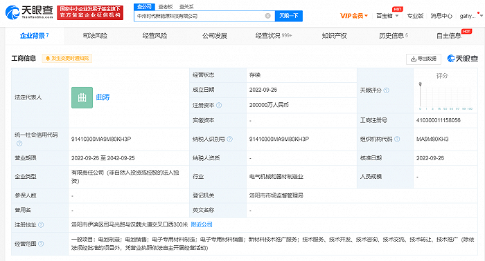 9月26日,中州时代新能源科技有限公司成立,法定代表人为曲涛,注册资本20亿人民币,经营范围包括电池制造、销售;电子专用材料制造、销售;新材料技术推广服务;技术服务等。股东信息显示,该公司由宁德时代新能源科技股份有限公司全资持股。