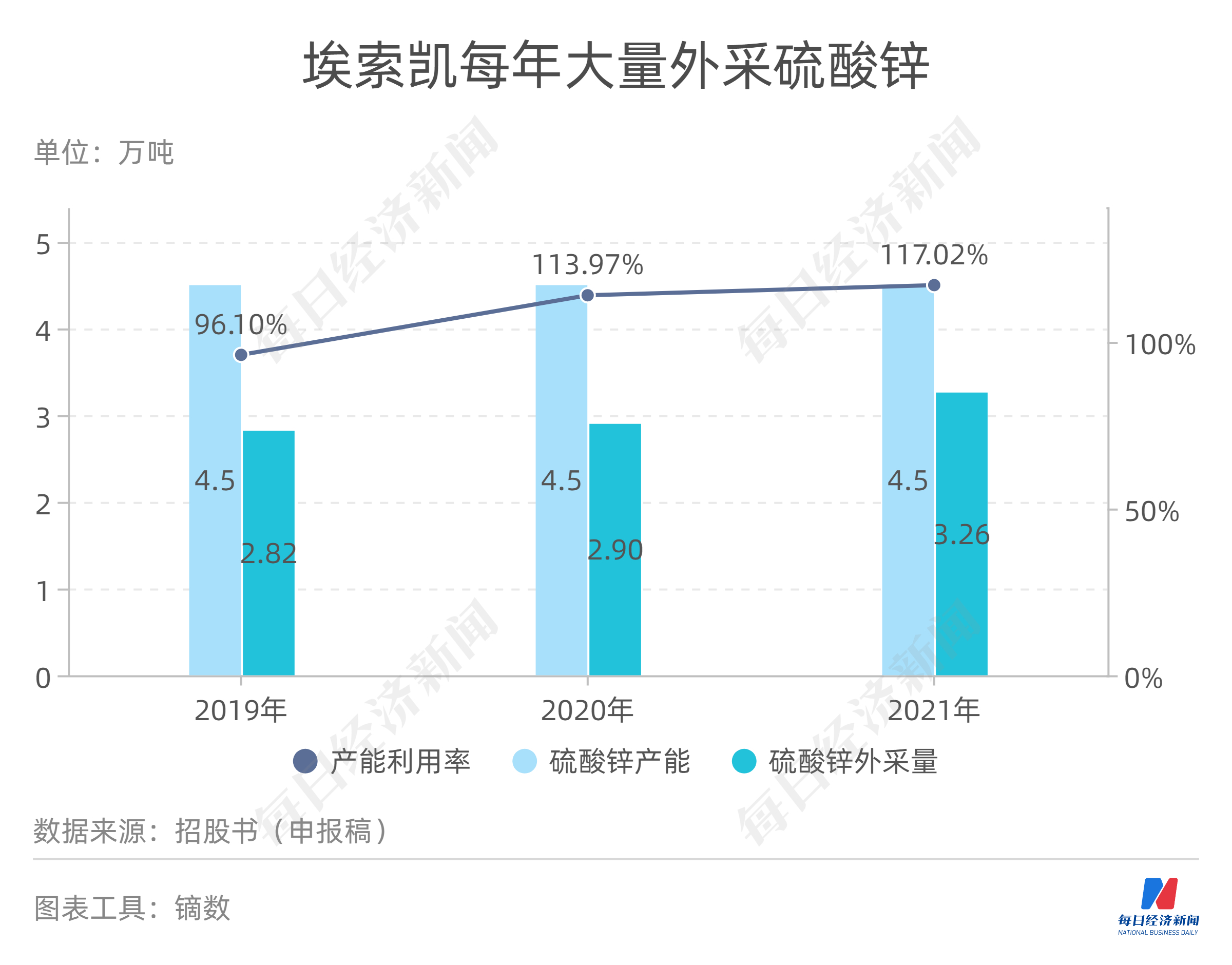 值得注意的是,硫酸锌早已出现产能饱和情况,埃索凯每年还需要大量外采硫酸锌,但公司近年来均未进行扩产。2019年~2021年,埃索凯硫酸锌产能均为4.5万吨,产能利用率分别达到96.10%、113.79%和117.02%,外采量分别达到2.82万吨、2.90万吨和3.26万吨,数量逐年增加。