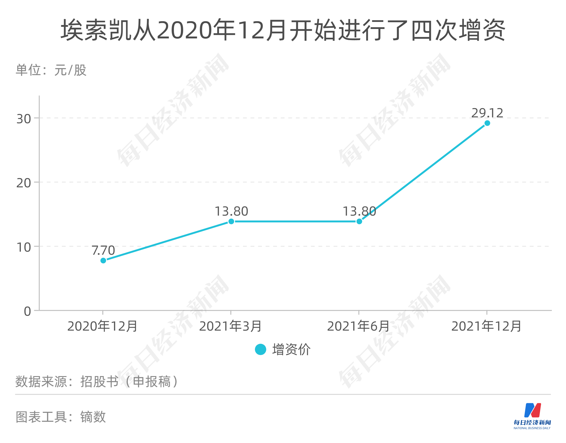 《每日经济新闻》记者注意到,埃索凯于2020年12月、2021年12月均通过增资扩股引入了新股东,两次增资价格分别为7.70元/股、29.12元/股,短短一年时间,增资价格差异达到2.78倍。
