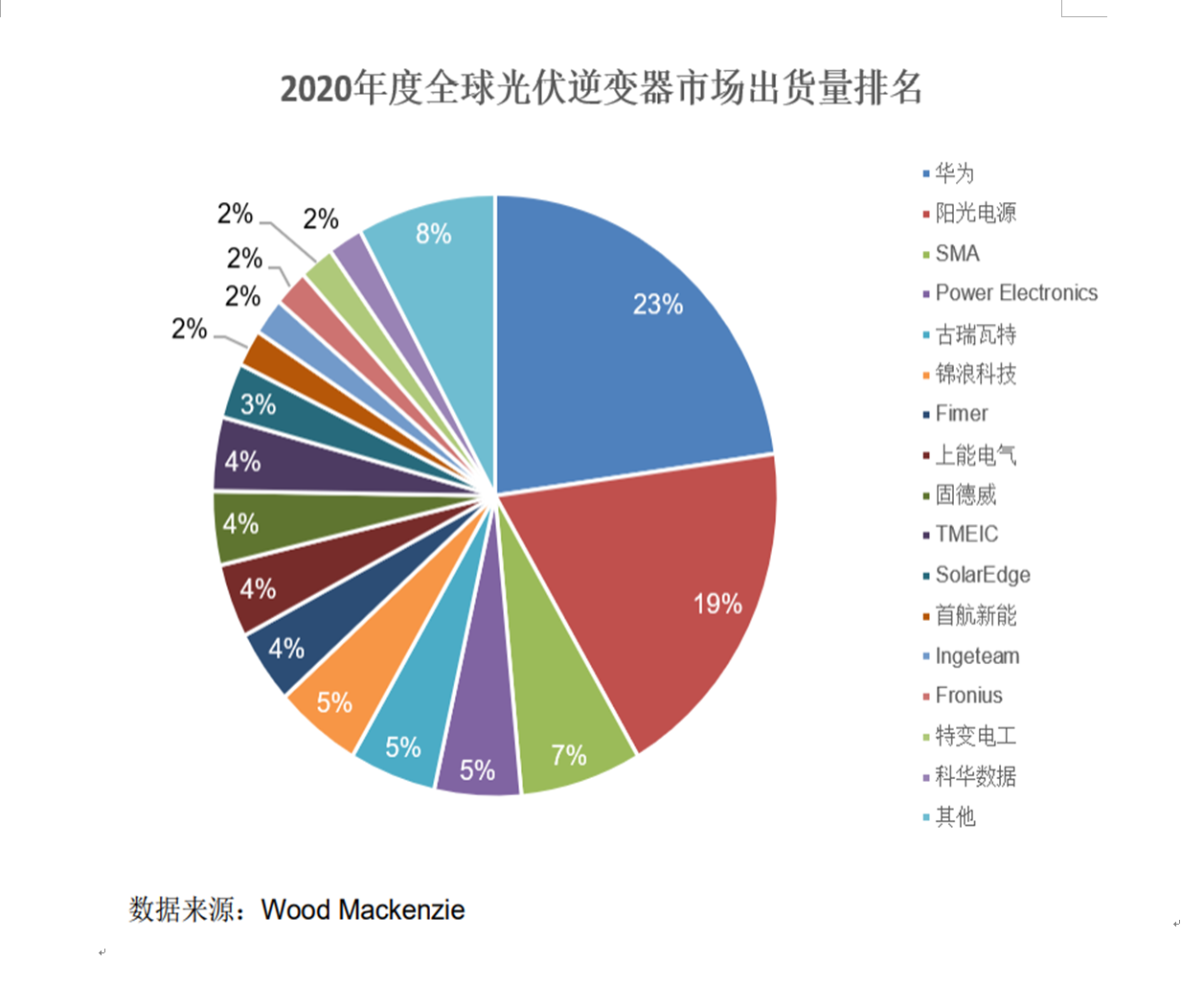 国际知名电力与可再生能源研究机构Wood Mackenzie发布的研究报告显示,2020年首航新能在全球光伏逆变器市场出货量位列第12位,市场占有率约为2%,位于华为、阳光电源(SZ300274,股价113.27元,市值1682亿元)、锦浪科技(SZ300763,股价227.77元,市值856.83亿元)、古瑞瓦特、上能电气(SZ300827,股价50.16元,市值119.18亿元)、固德威(SH688390,股价276元,市值340亿元)等中国厂商之后。