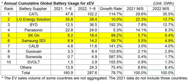 从全球各家动力电池装机量看,今年前8月,宁德时代仍然稳居第一。SNE Research数据显示,今年1至8月,宁德时代动力电池装机102.2GWh,同比增长114.7%。SNE Research纳入统计的全球动力电池生产企业平均装机增速为78.7%。