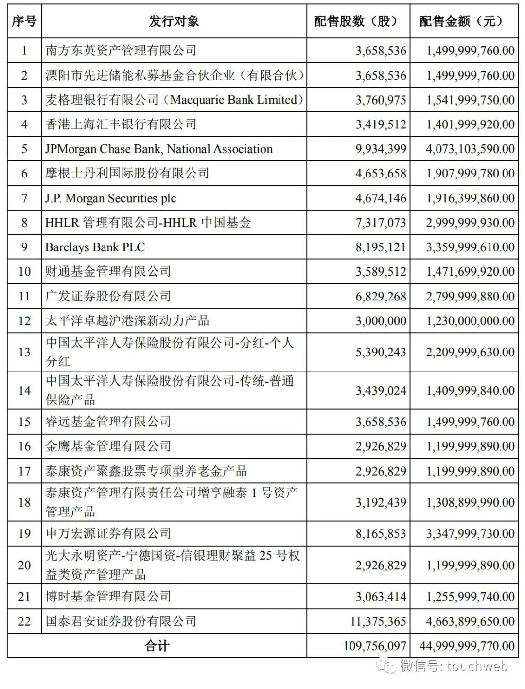 其中,认购最多的为国泰君安证券股份有限公司,认购46.64亿元,JPMorgan Chase Bank,National Association,认购金额40.73亿元,申万宏源证券有限公司认购33.48亿元,BarclaysBankPLC认购33.6亿元。