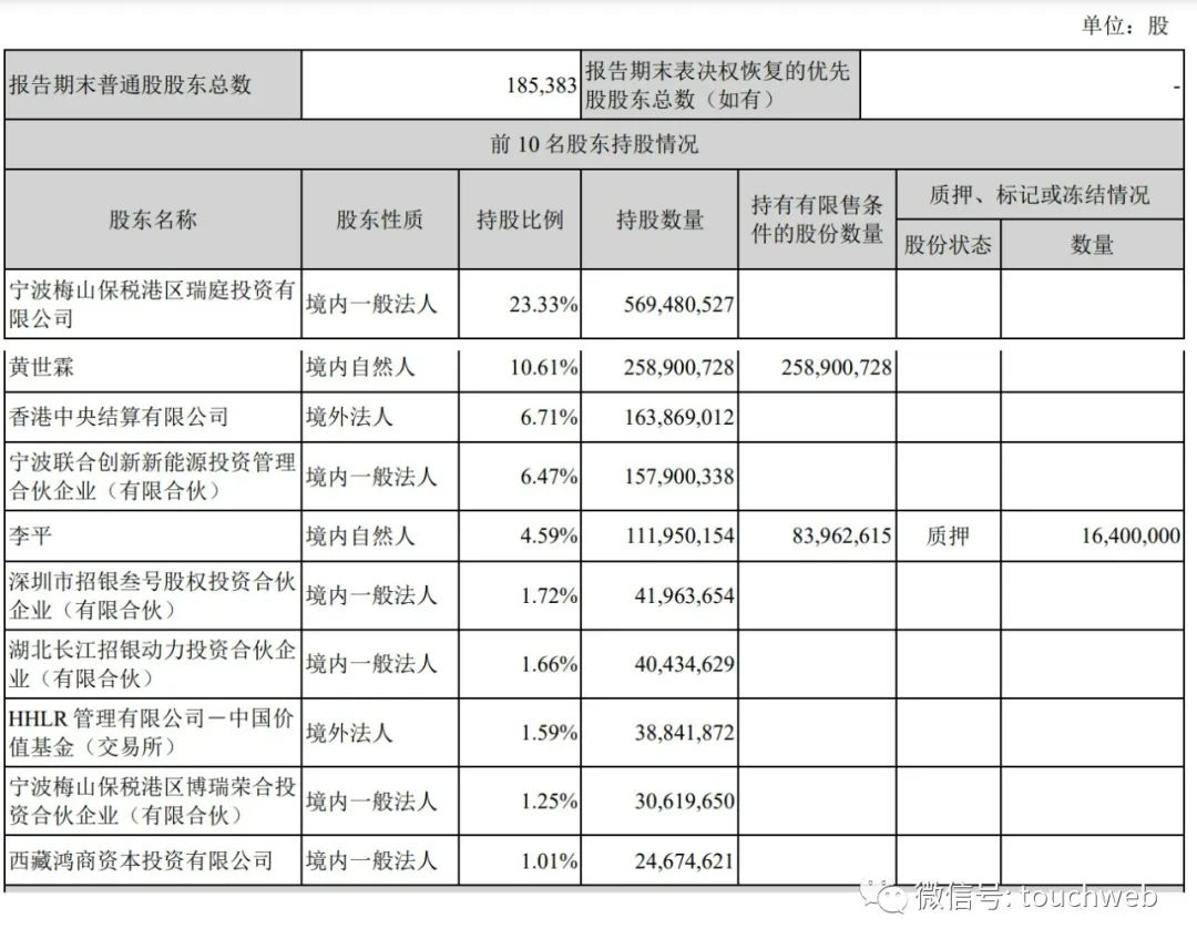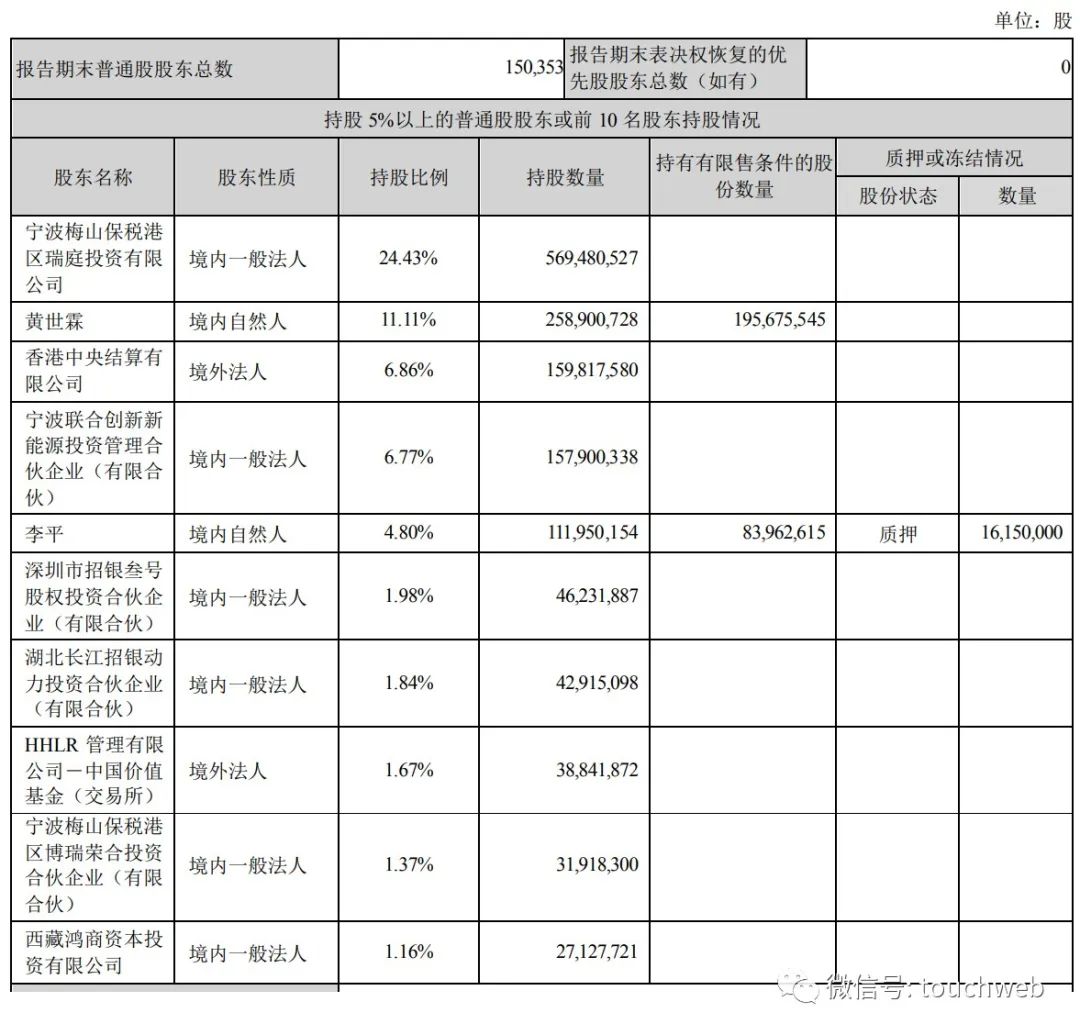 截至2022年6月30日,宁波梅山保税港区瑞庭投资有限公司持股为24.43%,黄世霖持股为11.11%,香港中央结算有限公司持股为6.86%,宁波联合创新新能源投资管理合伙企业(有限合伙)持股为6.77%;