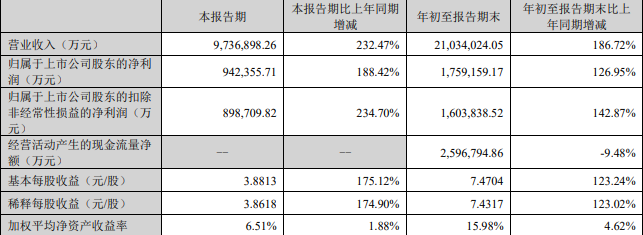 IT之家 10 月 21 日消息,今日晚间,宁德时代发布了最新业绩报告:第三季度营收 974 亿元,预估 663.7 亿元。Q3 净利润 94.24 亿元,同比增长 188.42%;前三季度净利润 175.9 亿元,同比增长 126.95%。