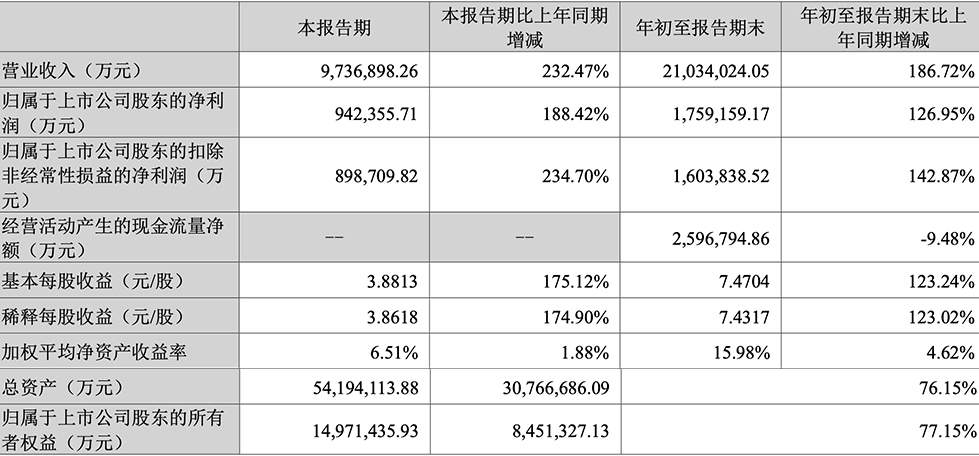 10月21日,宁德时代发布第三季度财报。今年第三季度,宁德时代营业收入973.69亿元,同比大增232.47%,归属于上市公司股东的净利润94.23亿元,同比增长188.42%。今年前三季度,宁德时代实现营收2103.40亿元,同比增长186.72%;净利润175.92亿元,同比增长126.95%;其中,前三季度净利润已超2021年全年净利,2021年宁德时代净利为159亿元。