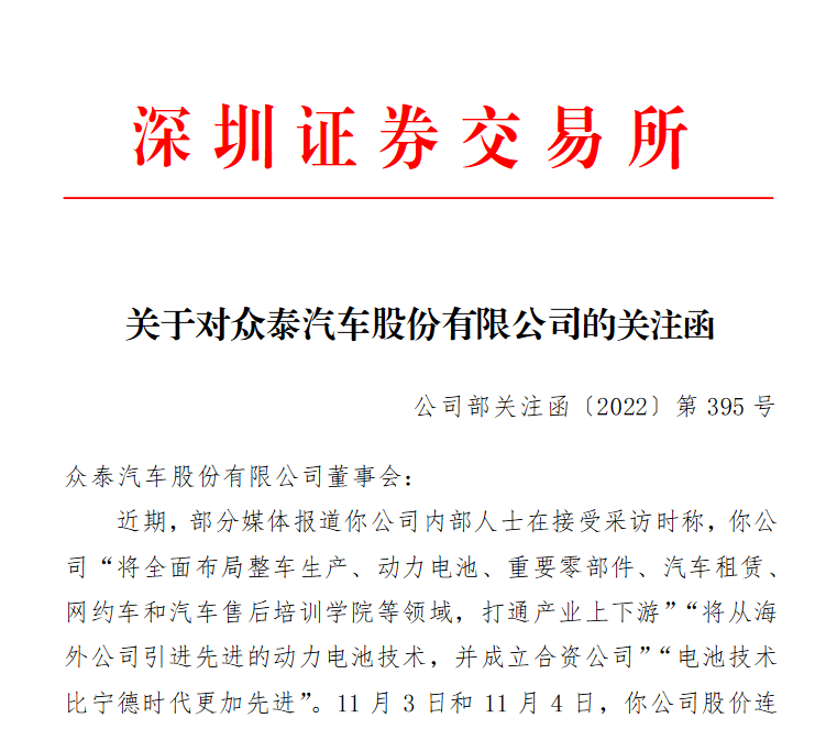 11月7日,众泰汽车发布澄清公告表示,经核实,公司董事、监事、高级管理人员及相关业务部门负责人近期内没有接受过相关媒体的采访,公司目前没有从海外公司引进先进的动力电池技术并成立合资公司事宜。