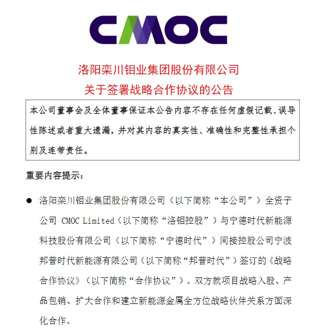 2021年8月,洛阳钼业发布公告,其子公司洛钼控股与宁德时代间接控股企业邦普时代签订合作协议,邦普时代通过香港子公司时代新能源,以1.375亿美元对价获得洛钼控股旗下KFM控股的25%股权。