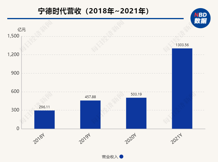在宁德时代之前,创业板总市值第一名的位置从未超过2000亿元,而宁德时代一度把这个位置推高至了1万亿。2018年至2021年,宁德时代的营业收入从296亿元增长至1303亿元,归母净利润也从33.9亿元增长至159亿元。