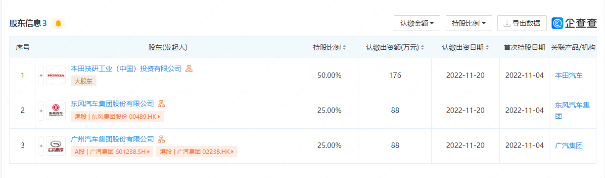 信息显示,众锐公司成立于今年11月4日,注册资本为352万元。本田技研工业(中国)投资有限公司(以下简称本田中国)、东风汽车集团股份有限公司、广汽集团(SH601238,股价12.18元,市值1275亿元)分别持股50%、25%、25%。